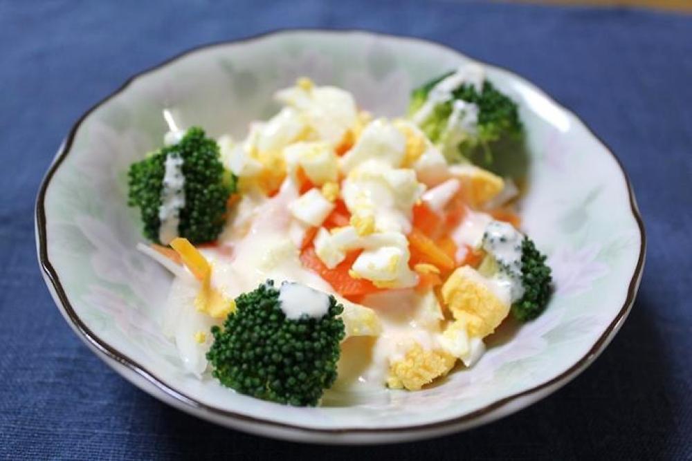 お皿にブロッコリー・人参・ゆで卵・玉ねぎをのせ、マヨーグルトドレッシングをかけたら出来上がり。