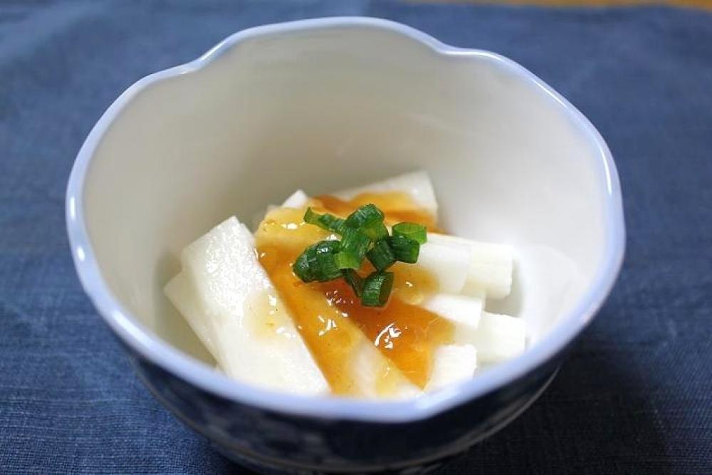 皮を剥いて細切りした長芋をお皿にのせ、ポン酢ジュレ・万能ねぎをかけたら出来上がり。