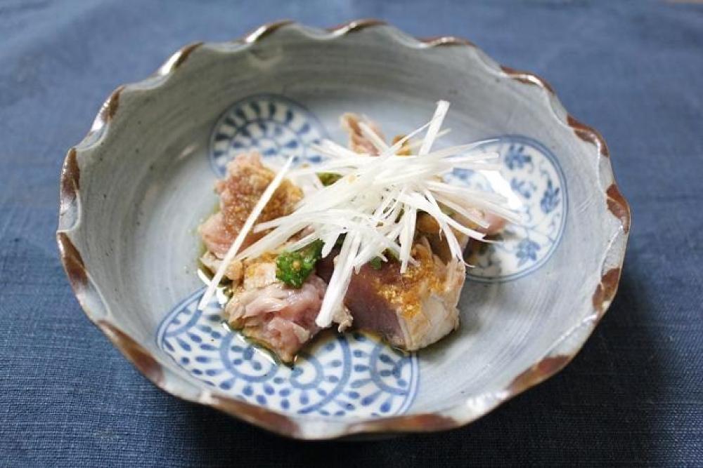 まぐろを入れて全体を和えたらお皿にのせ、白髪ねぎをのせたら出来上がり。