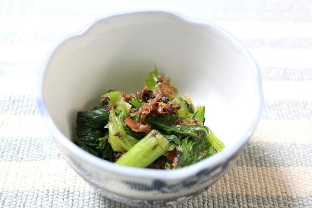 小松菜を加え、全体が馴染むように和えたら出来上がり。
