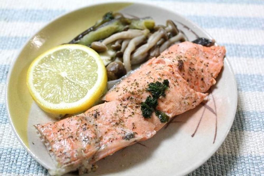フライパンにしめじ・なすを敷いたら、鮭の切り身をのせます。