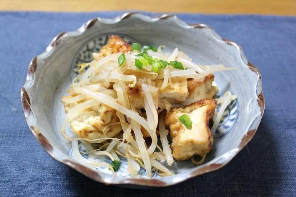 お皿に厚揚げ・もやしをのせ、みぞれソースをかけ、万能ねぎを散らしたら出来上がり。