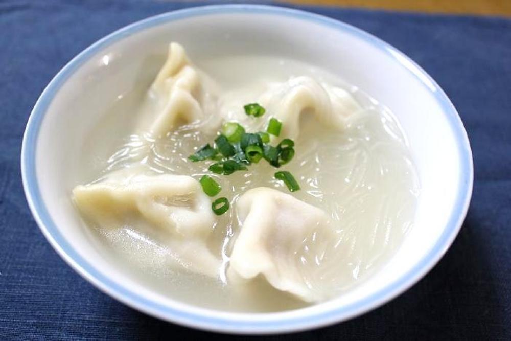 春雨・市販の水餃子を入れて煮立てて器に盛り、万能ねぎを散らしたら出来上がり。