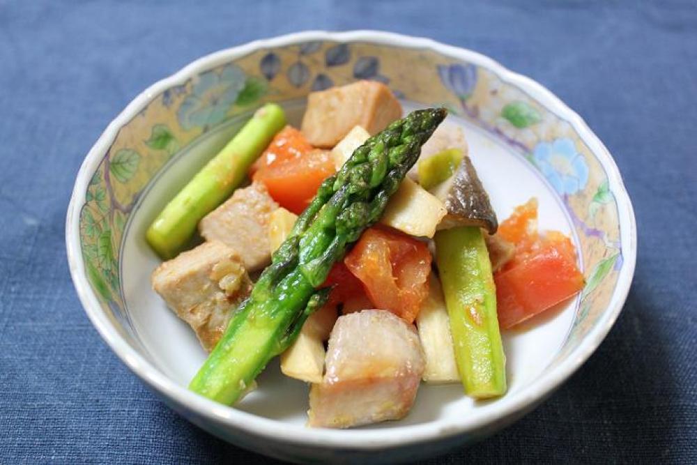 まぐろ・エリンギ・アスパラ・トマトを入れて炒め、塩コショウで味を整えたら出来上がり。