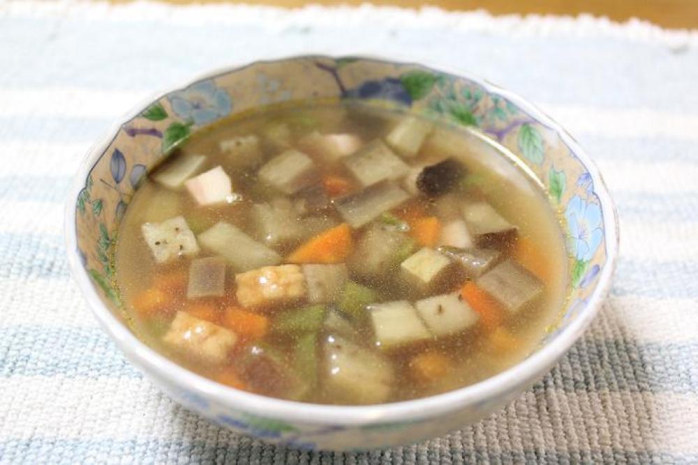 しんなりしたら水を加え、沸騰したらコンソメスープの素と塩コショウで味を調えて出来上がり。