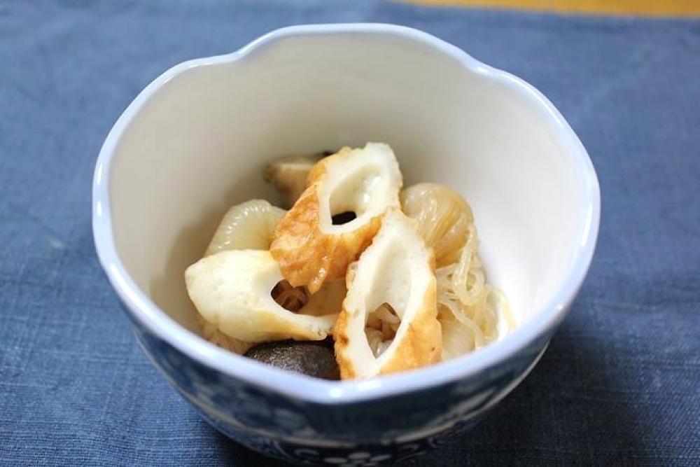鍋に結び糸こんにゃく・椎茸・ちくわ・薄めためんつゆを入れ、煮汁がなくなるまで煮詰めたら出来上がり。