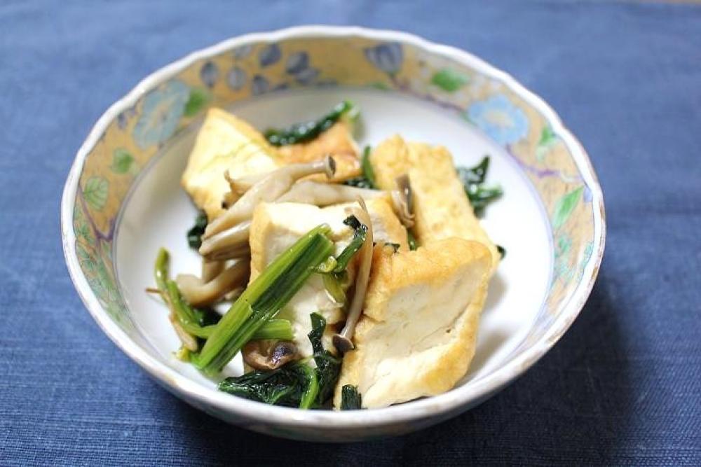 ごま油を熱したフライパンで、ほうれん草・厚揚げ・しめじを炒めます。