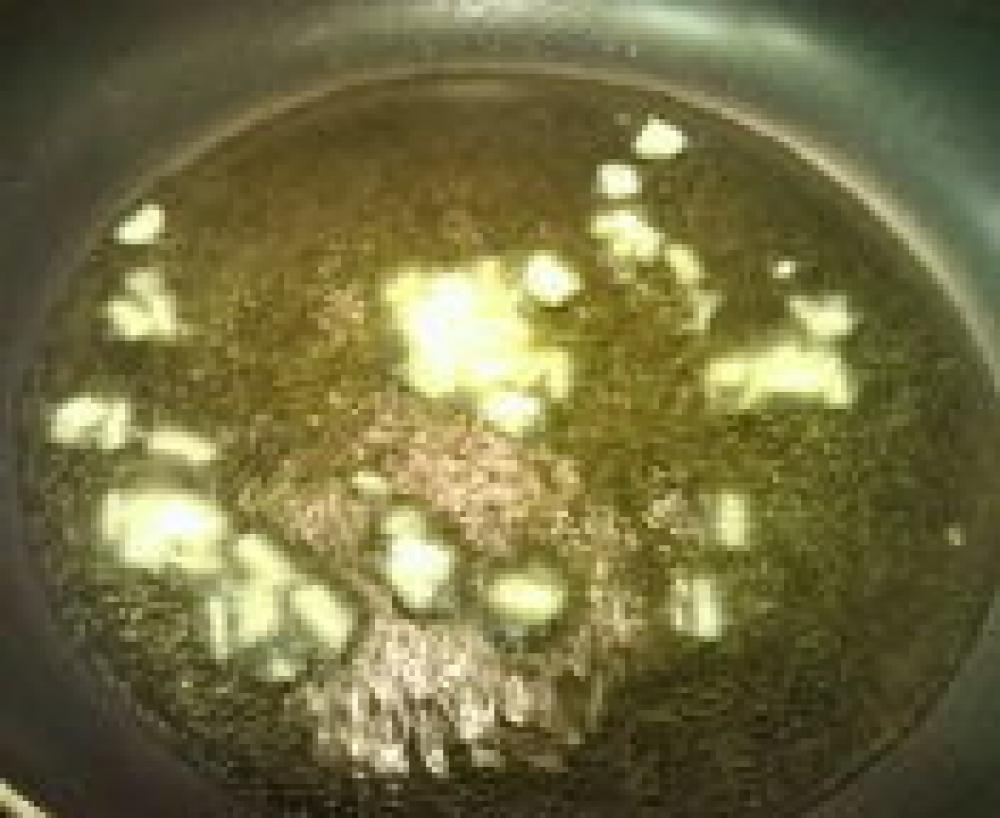 ![]() オリーブオイルににんいくを入れ、弱火でじっくり香りが出るまで加熱する。