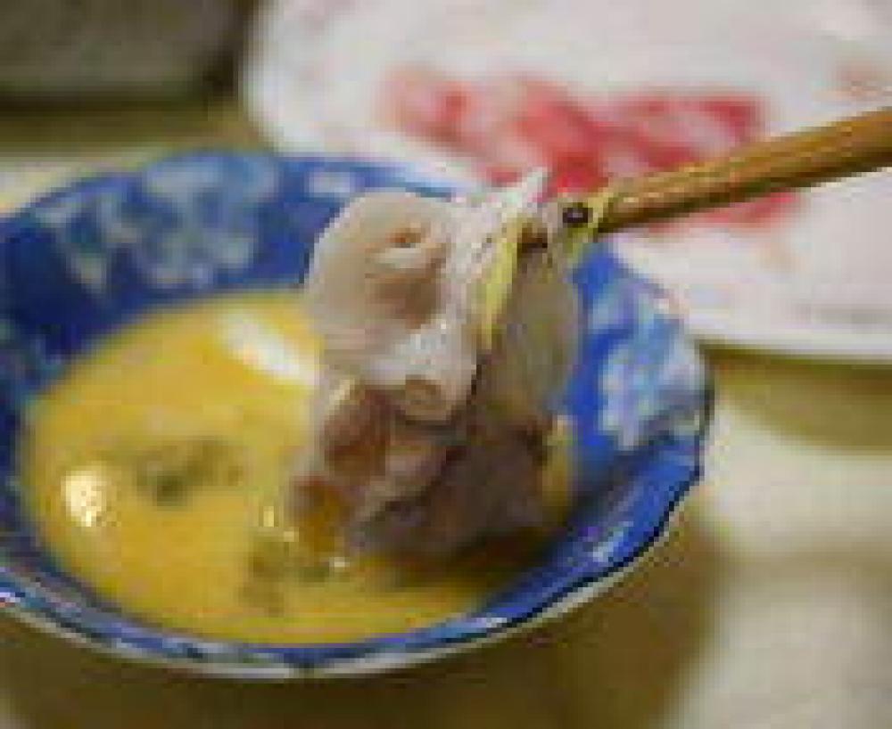 ![]() 沸騰したらネギを入れてから肉を入れる。※まずはこの段階で溶いた卵をつけて食べてみて下さい。