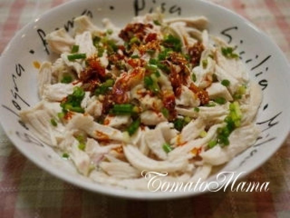 1が冷めたら鶏胸肉を手で裂き、万能ネギを散らしラー油をかけて完成。※汁はそのまま残し裂いた鶏胸肉と混ぜ合わせておく。