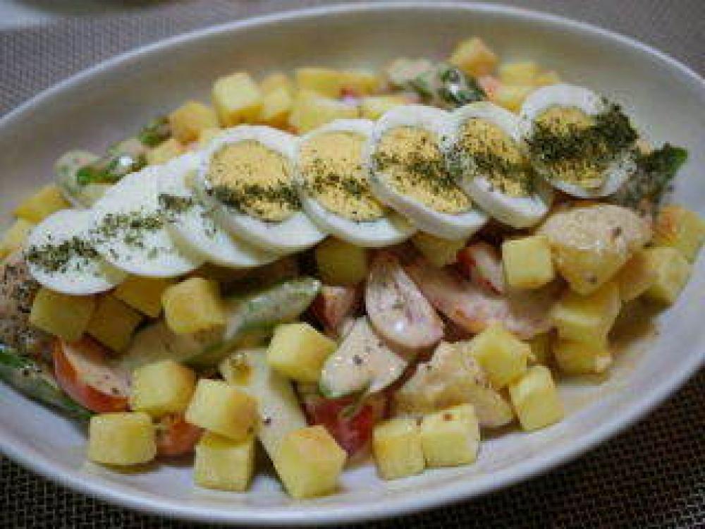![]() ソースを作り、全ての材料に混ぜ合わせ茹で卵を並べ乾燥パセリをふって完成!