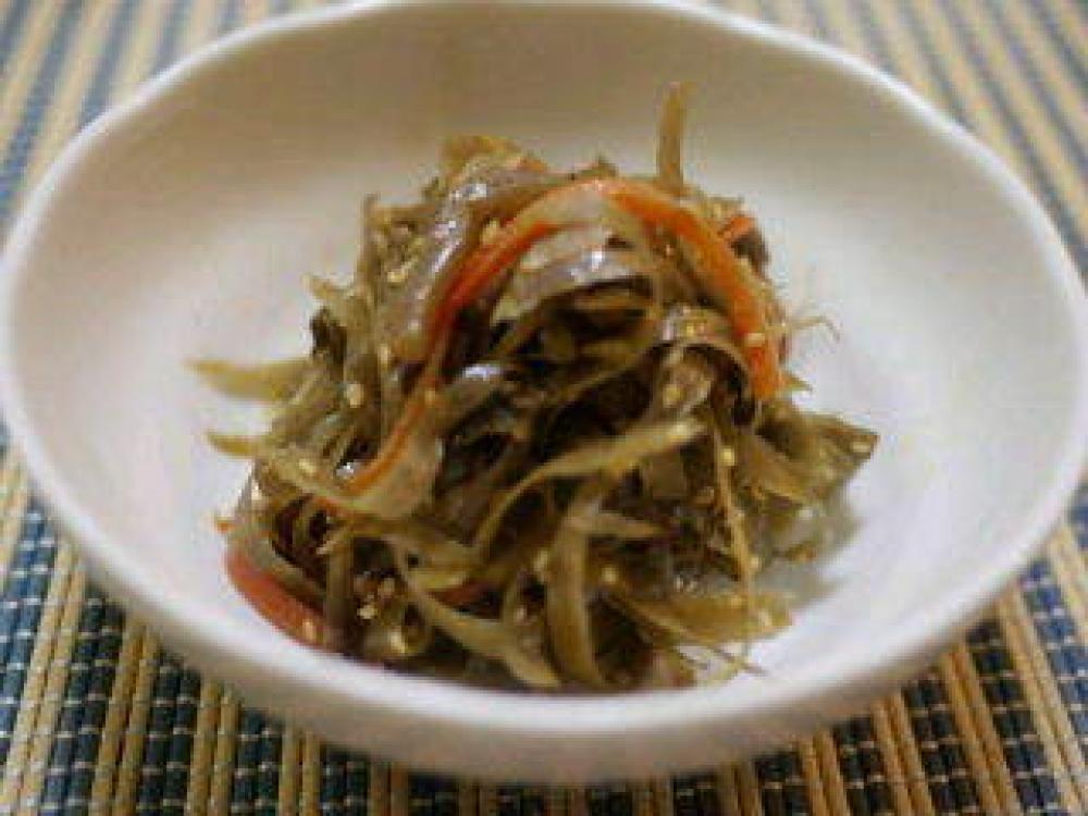 ![]() 醤油を鍋肌から加えて炒め水分がなくなったら火を止めてすぐにごま油を鍋はだから加えてよく混ぜ、白胡麻を加え混合わせる。