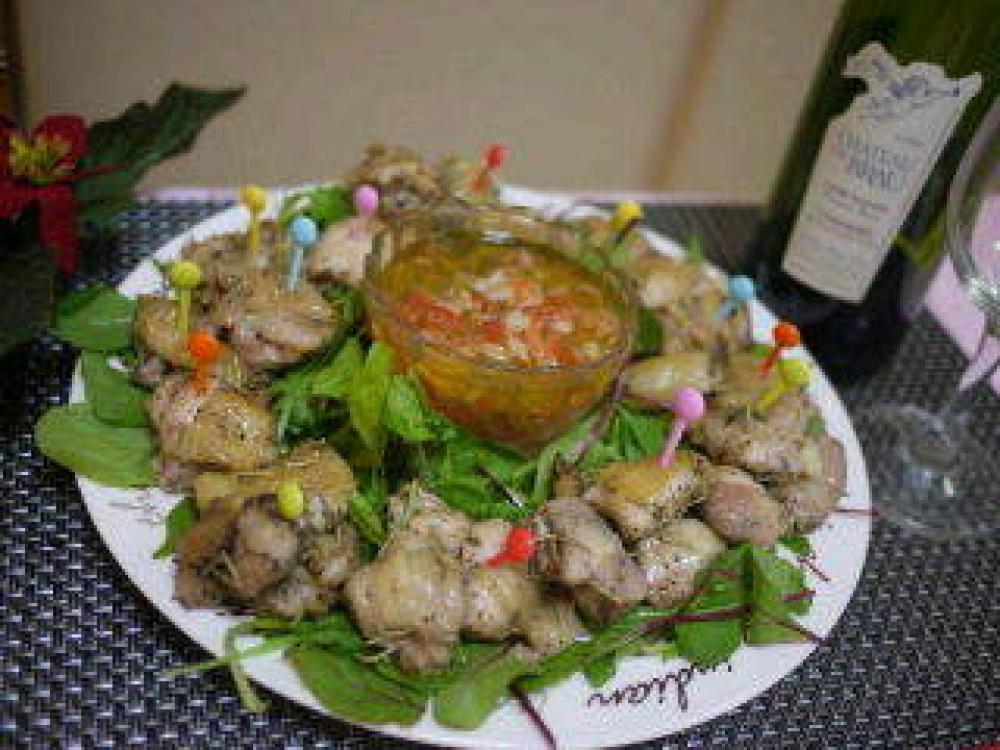 ![]() 【チキン】大きめの1口大に切り塩胡椒をしてビニール袋に入れ、*印を入れ冷蔵庫に半日以上寝かせる。
