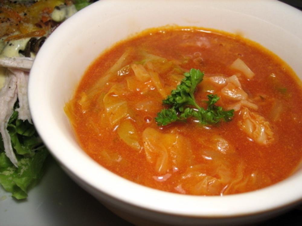 水と顆粒コンソメ、トマトジュースを加え、中火で2分程軽く煮込み、塩こしょうで整える