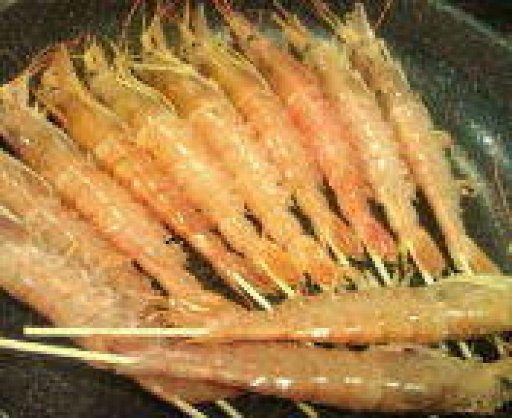 ![]() 腹を縦にはさみを入れ、串打ちする。※こうするとちびっこちゃんでも殻が剥きやすい。
