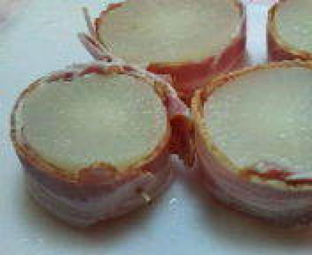 ![]() 味が染みたダイコンにベーコンを巻き、楊枝で巻き終わりを止める。