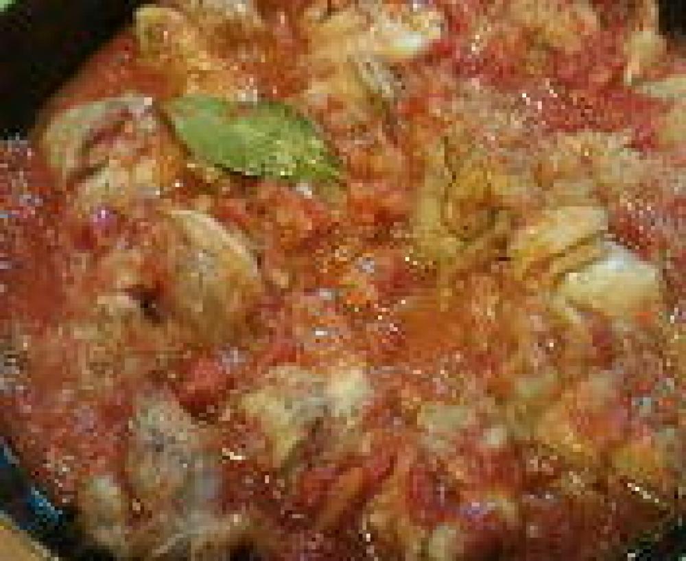 ![]() 火が通ったらカットトマト・ローリエ塩・胡椒を入れ蓋をして強火で煮る。ふつふつして来たら弱火で10分煮こむ。