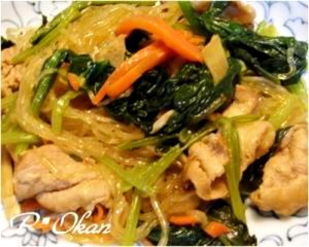 2に小松菜、よくほぐした春雨、水、調味料を入れて炒めたらでき上がり。