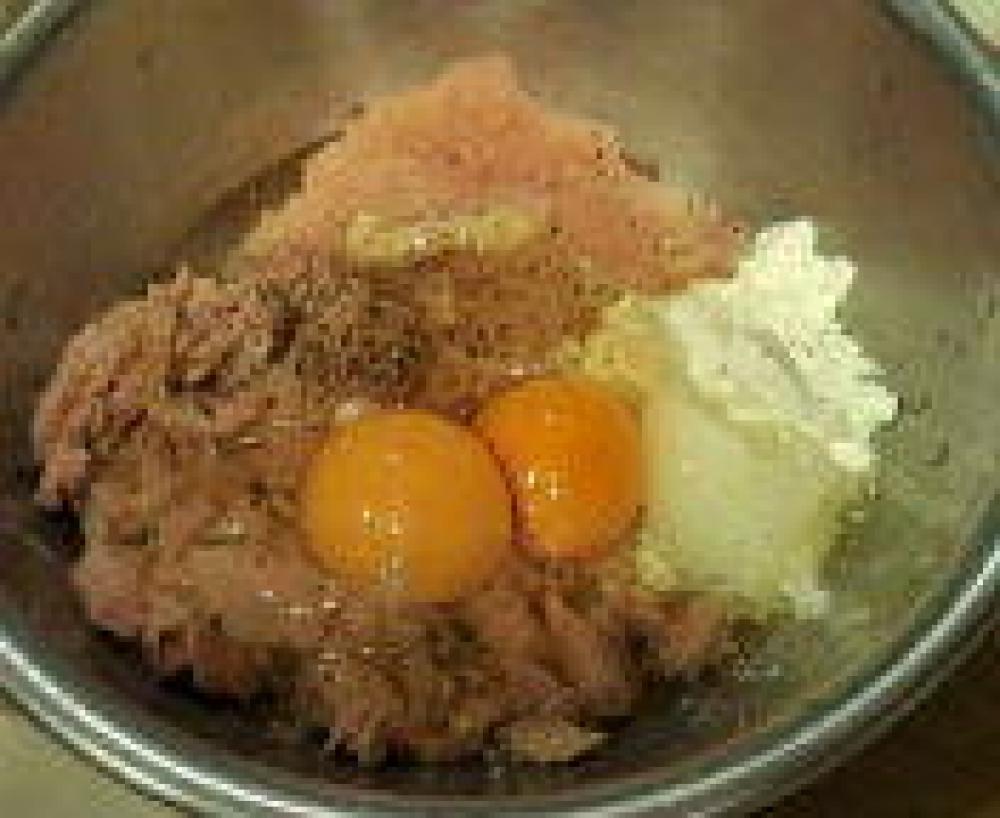 ![]() 鶏胸肉は包丁で切って叩きミンチにする。スライスチーズを細かくまとめておく。