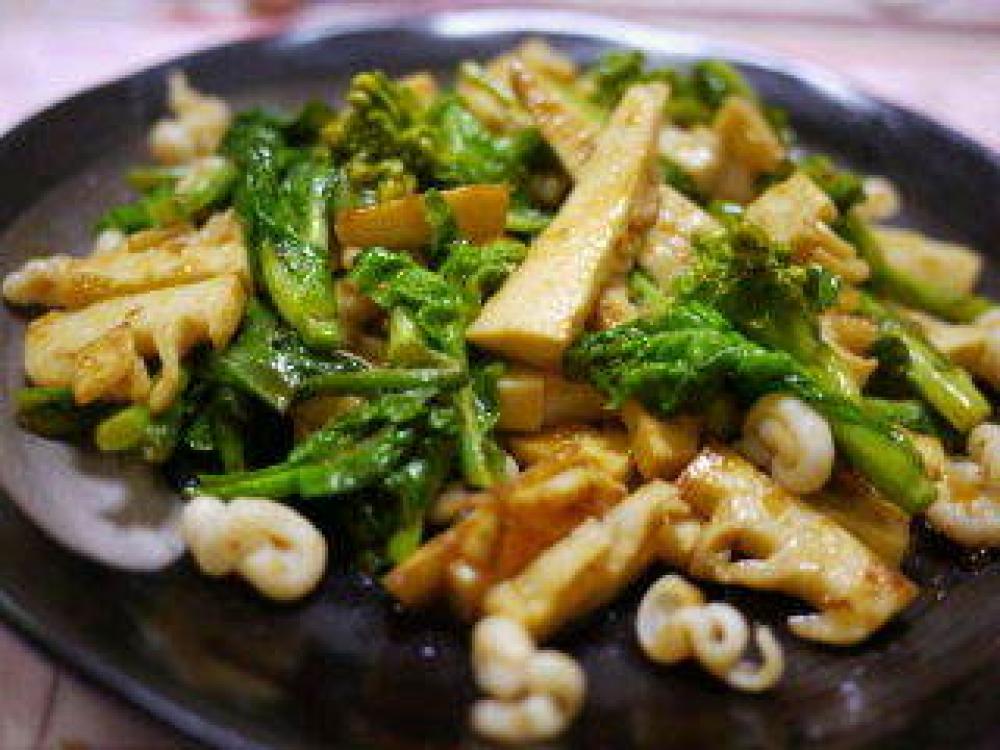 ![]() 2に菜の花を入れ茎を先に入れ炒め、1分したら葉の部分を炒め青しそドレッシングを入れ混ぜ合わせて完成です。