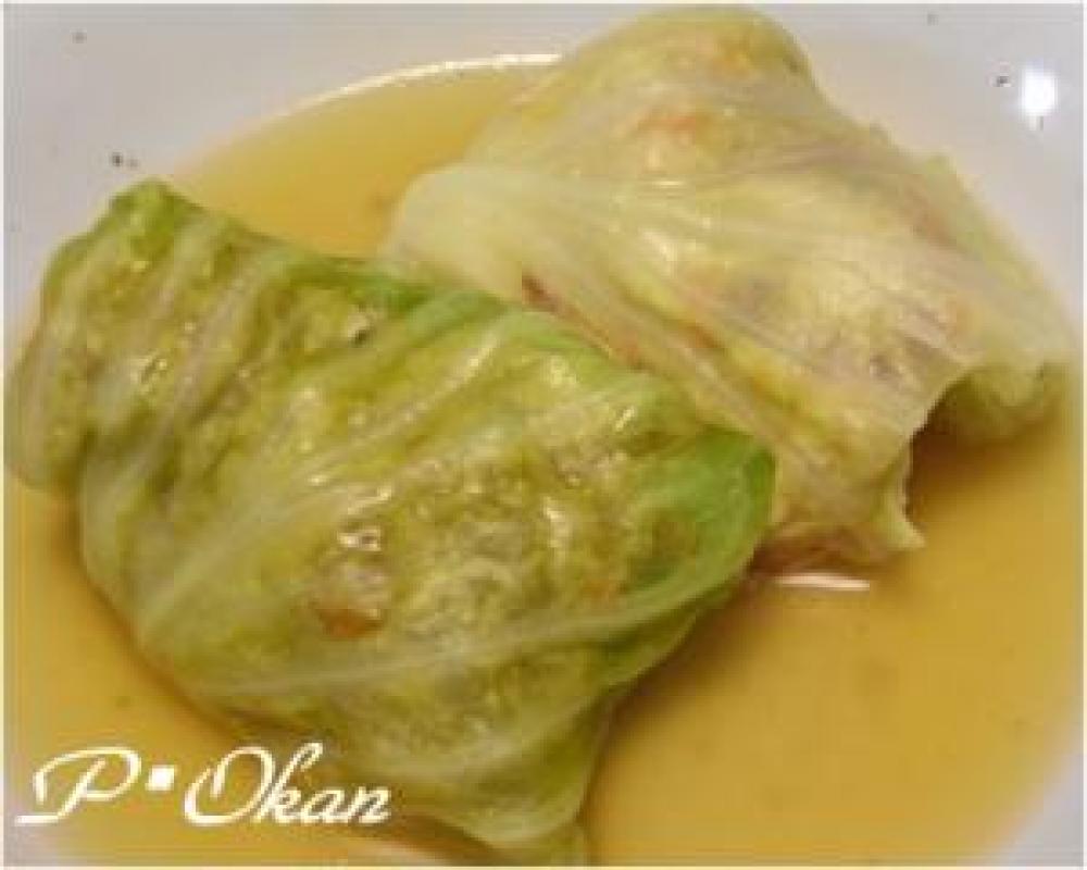 ![]() 鍋に分量の水とコンソメを入れて加熱しておく。その間1のキャベツで2を包む。巻き終わりはスパゲティの折ったもので巻くと便利