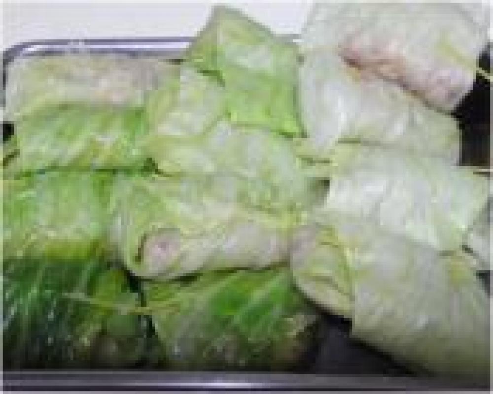 キャベツの外葉大15枚を鍋で軽く湯掻く。巻きやすいようにスジの固い部分は取る。