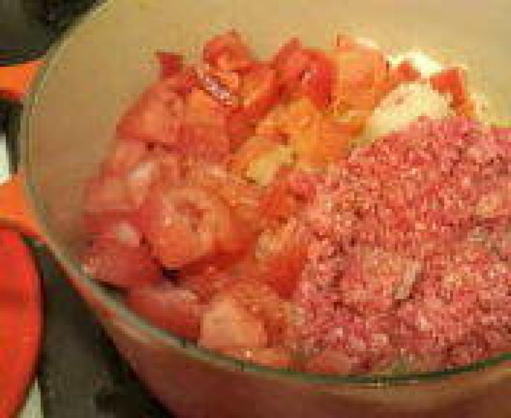 ![]() みじん切りにした玉ねぎ・角切りにしたトマト・挽肉を投入し、良くかき混ぜながら炒める。