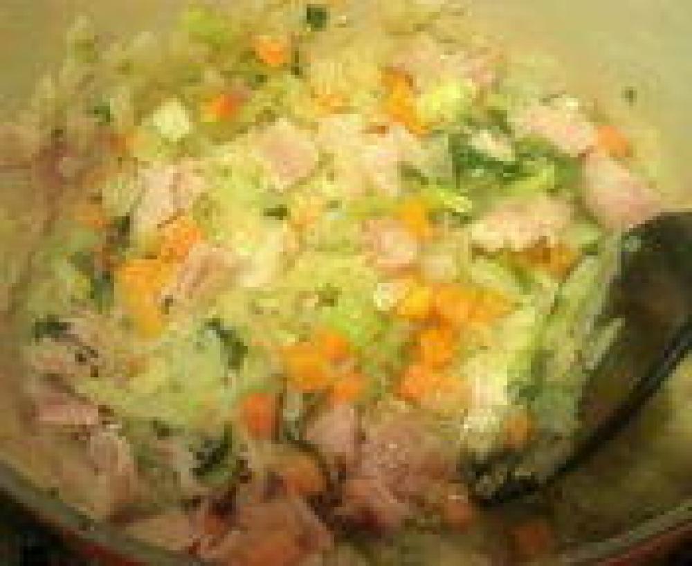 ![]() お鍋にオリーブオイルを入れ、にんにくを炒め野菜とベーコンを良く炒める。(新じゃがは1番最後に入れる)