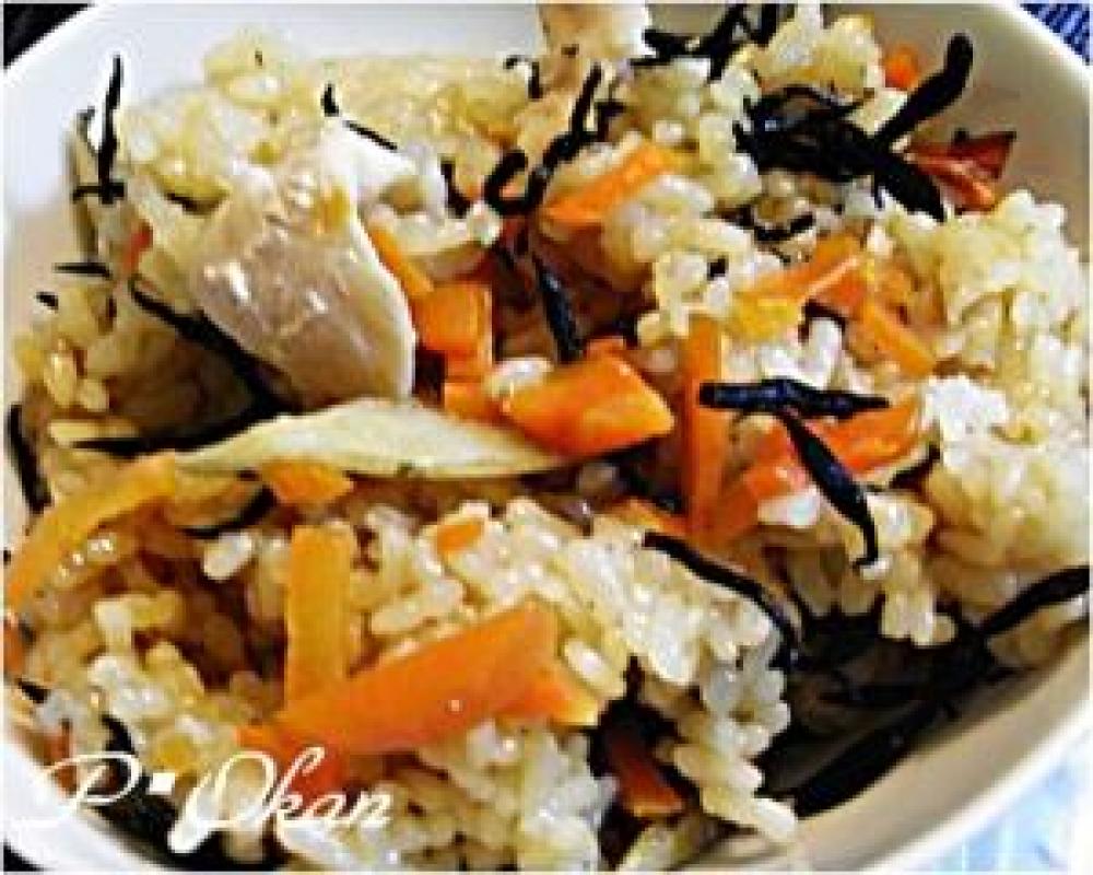炊飯器にコメ、基準の水、調味料、1の材料も入れて炊いたら出来上がり。