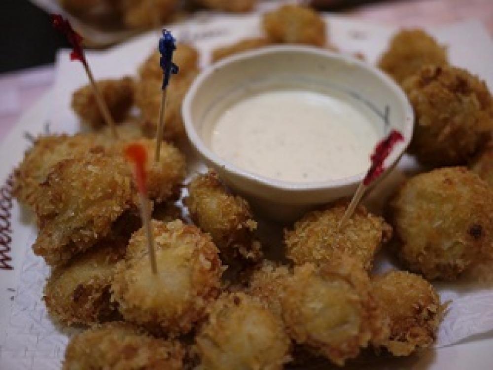 ![]() <フライの材料>ボイルベビーホタテ・タラ・マッシュルーム、タラは、ひと口大に切って