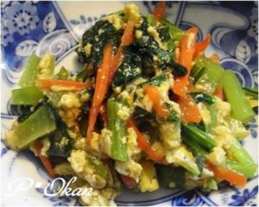 2の卵を一旦別皿に取り出し、人参、小松菜を炒め、味覇、醤油で味付けする。