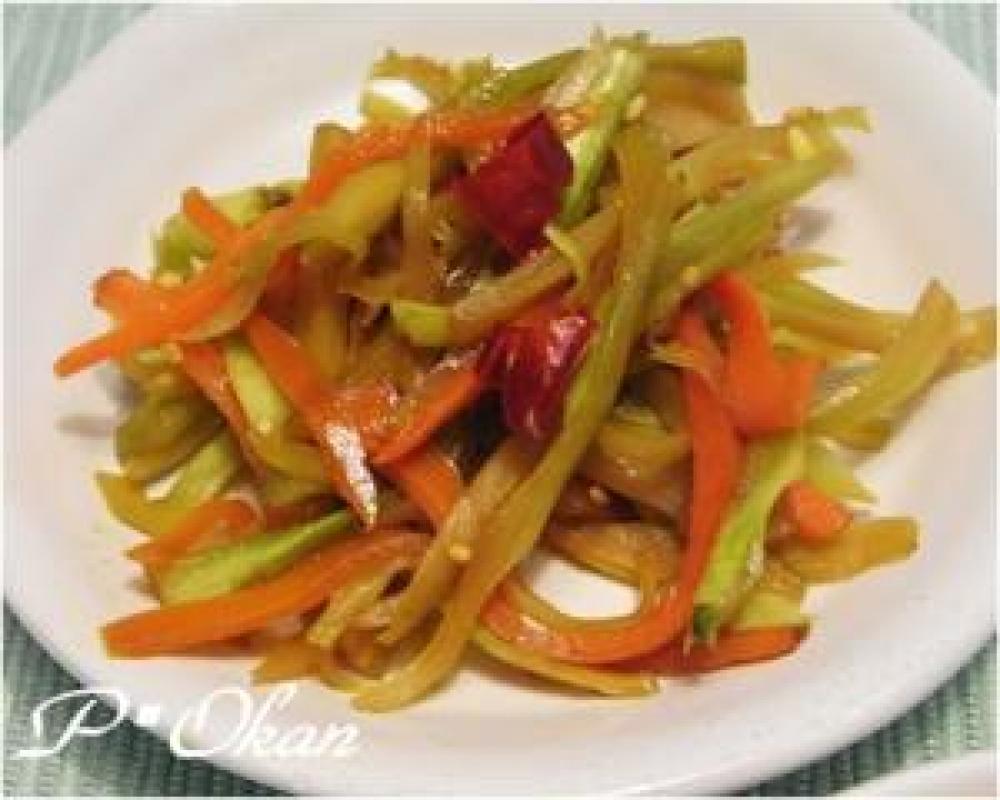 ブロッコリーの茎、人参は千切りにする。