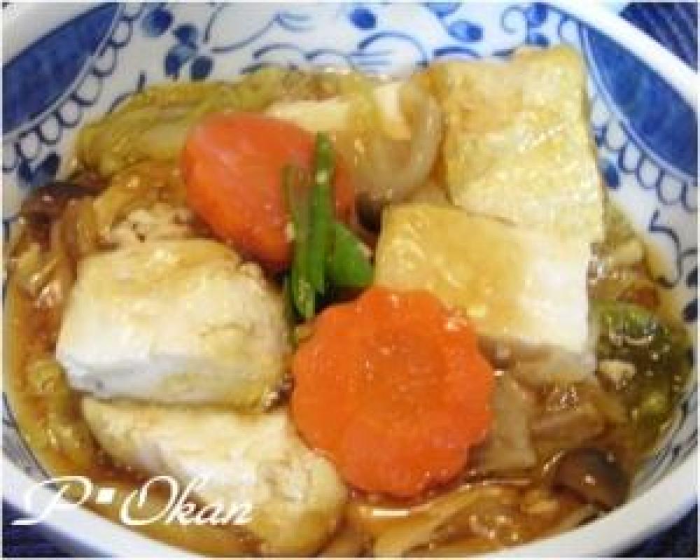 鍋にだし汁を入れて沸騰させ1の野菜と調味料を入れ野菜がしんなりしてきたら2の豆腐を入れて煮込む。