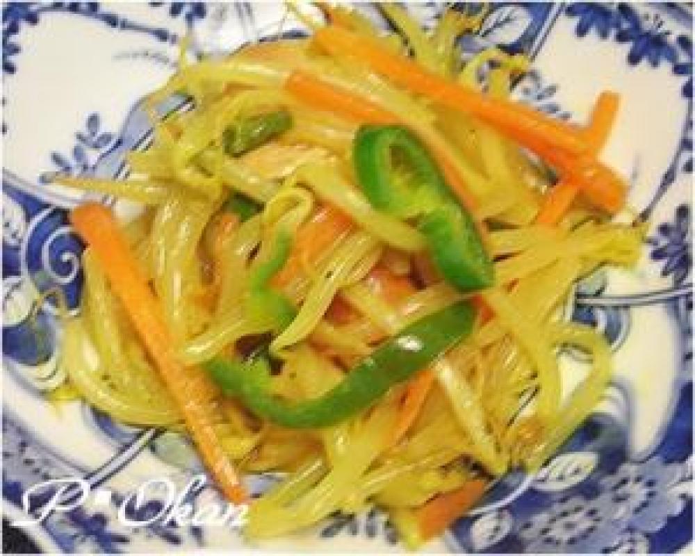 フライパンにサラダ油をいれて熱し、ベーコン、人参モヤシ、ピーマンの順に入れ、ターメリック、味覇も入れて炒める。