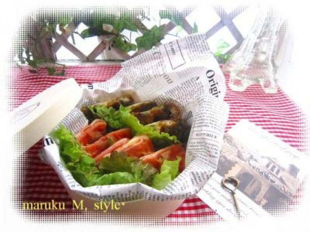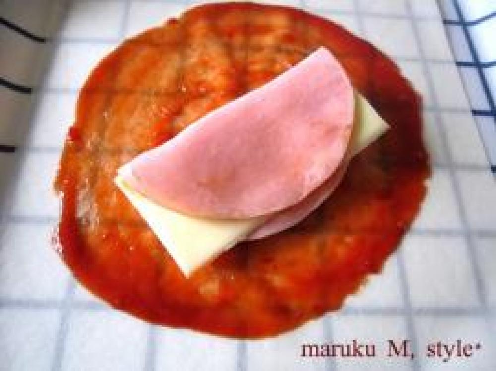 ![]() そこへ、チースは半分に折りハムで挟んで中から出るのを防ぎます。