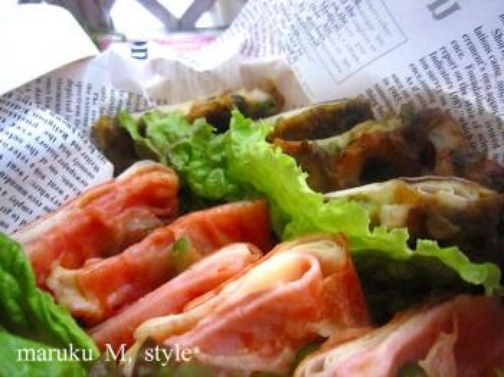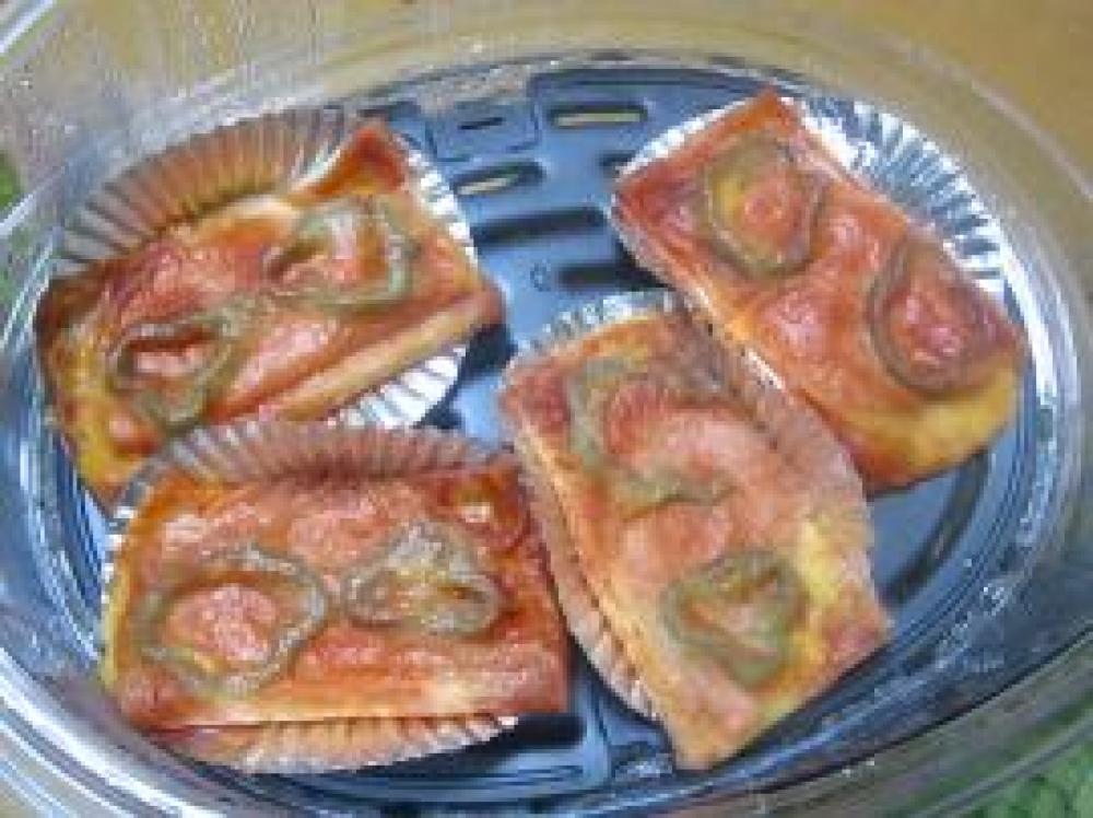 ![]() 春巻きの皮にピザソースを塗りピーマンを表になった時に見えるように置きます。