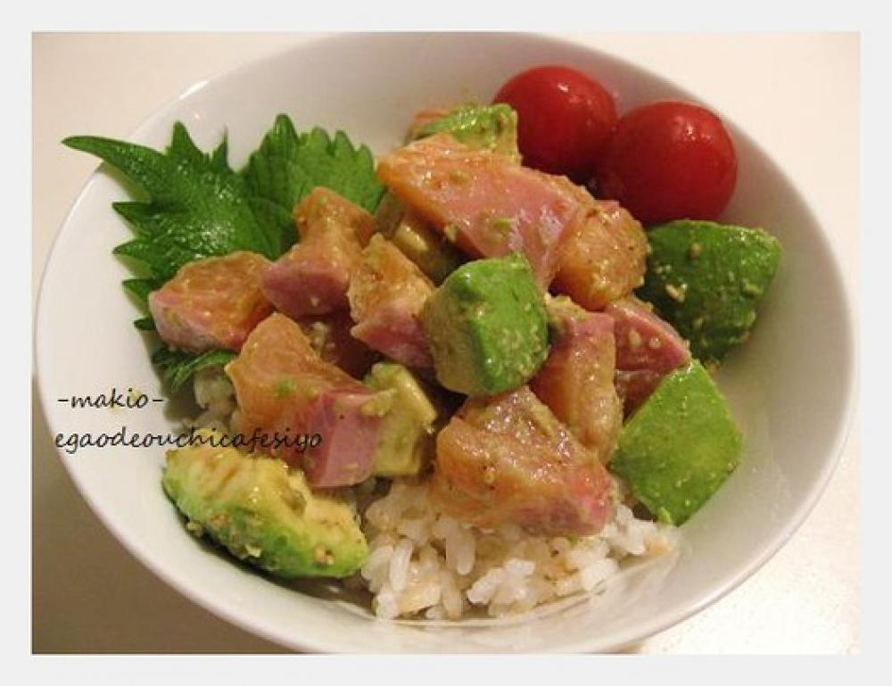 小さめの丼ぶりにご飯を盛り付け、ご飯の上にシソを乗せる。その上に先ほど作ったサーモンとアボカドを乗せる。