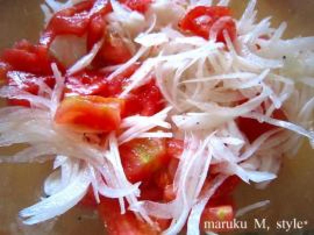 ![]() ボールに★を入れて新玉ねぎとトマトを入れてさっと混ぜます。20分おど置いておくと塩分で野菜がしんなりしてきます。