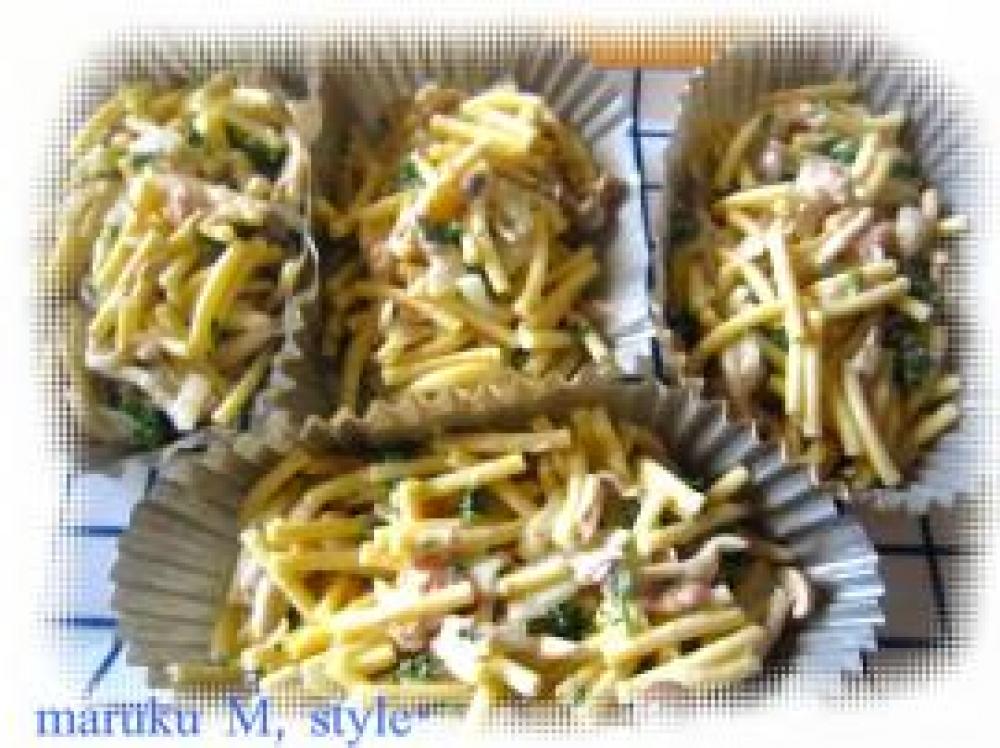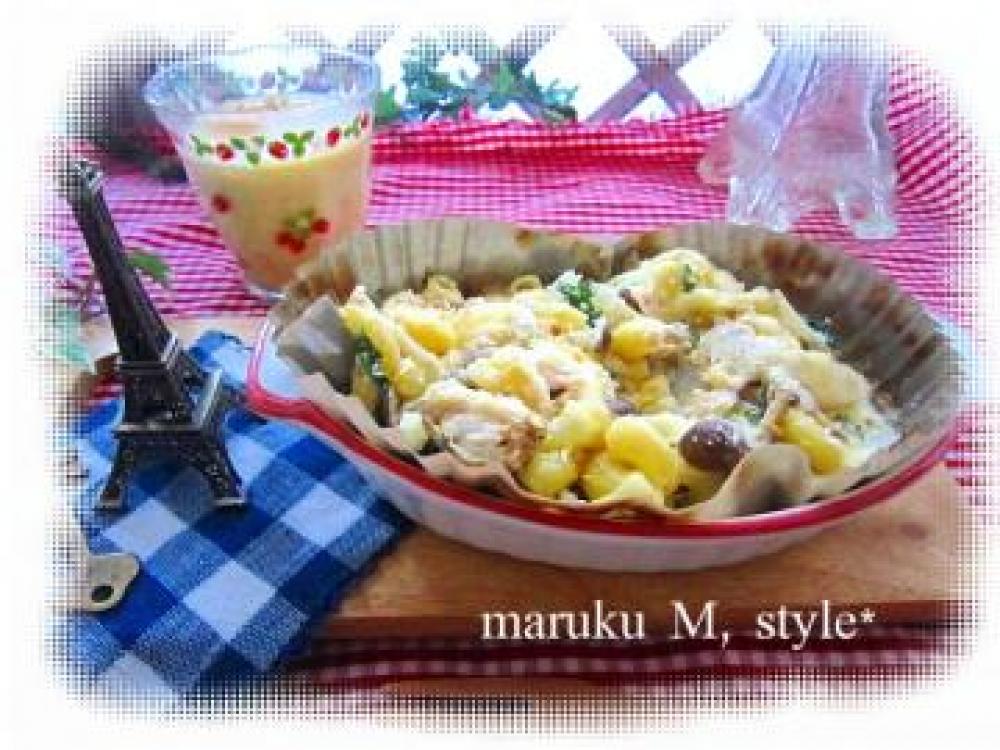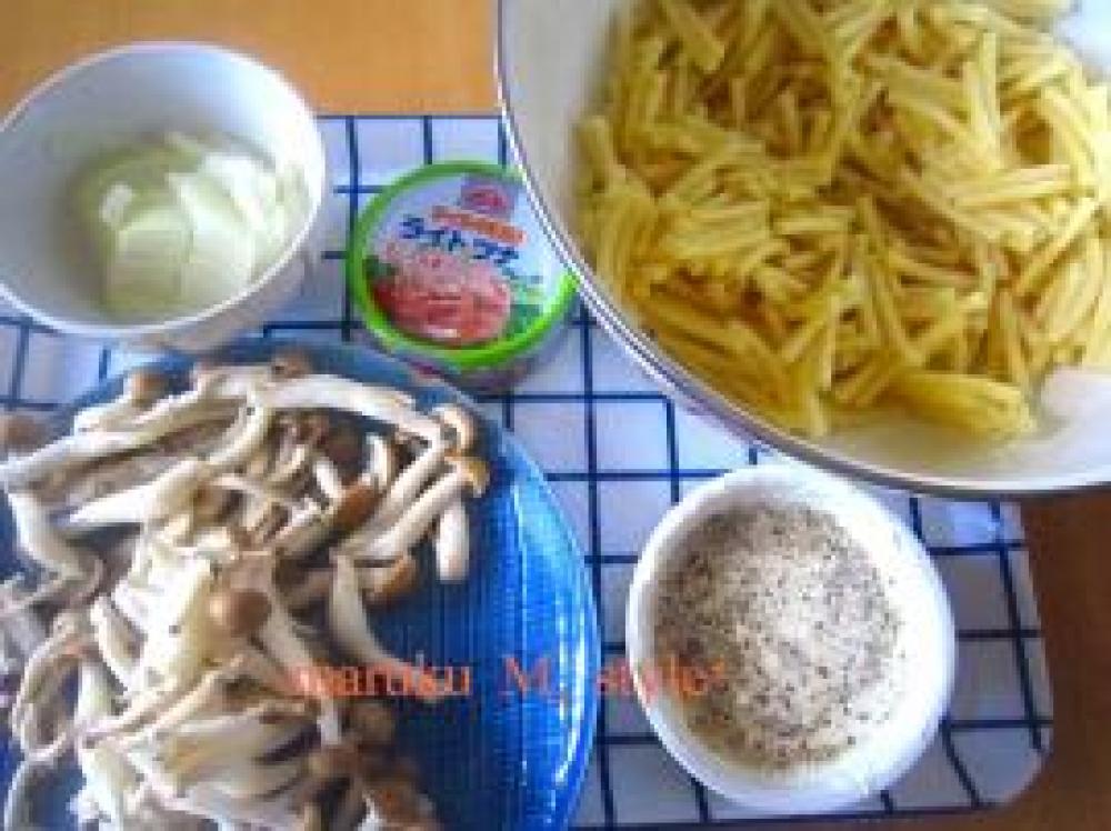 ![]() しめじもレンジで2分かけて火を通しておきます。よく水気を切ったマカロニをボールに入れます。