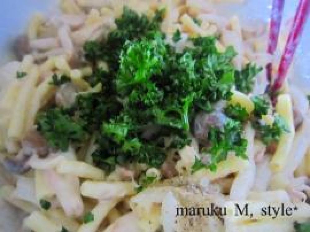 ![]() そこへ、①のホワイトソースを絡めます。上から、生パセリも入れてさらによく混ぜます。