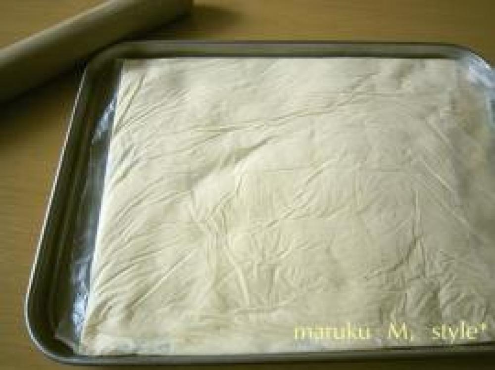 ![]() 後は生地を冷蔵庫で寝かして少し硬くします。とても柔らかくて扱いにくいです。