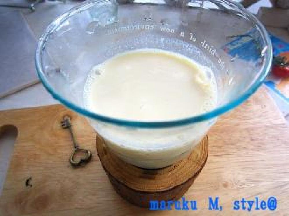 その中へ、ゼラチン(①と同じようにしておきますが、レンジで温める時間は15秒)を入れ、