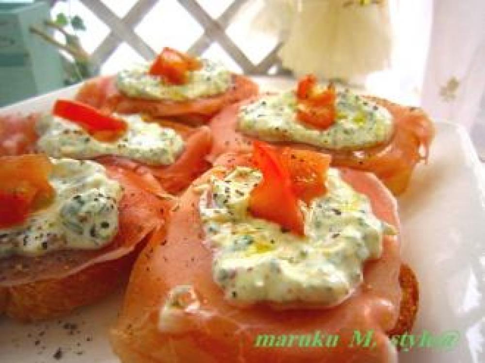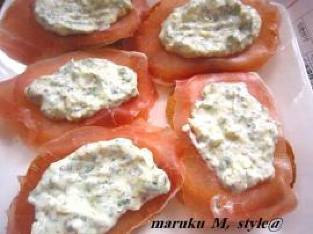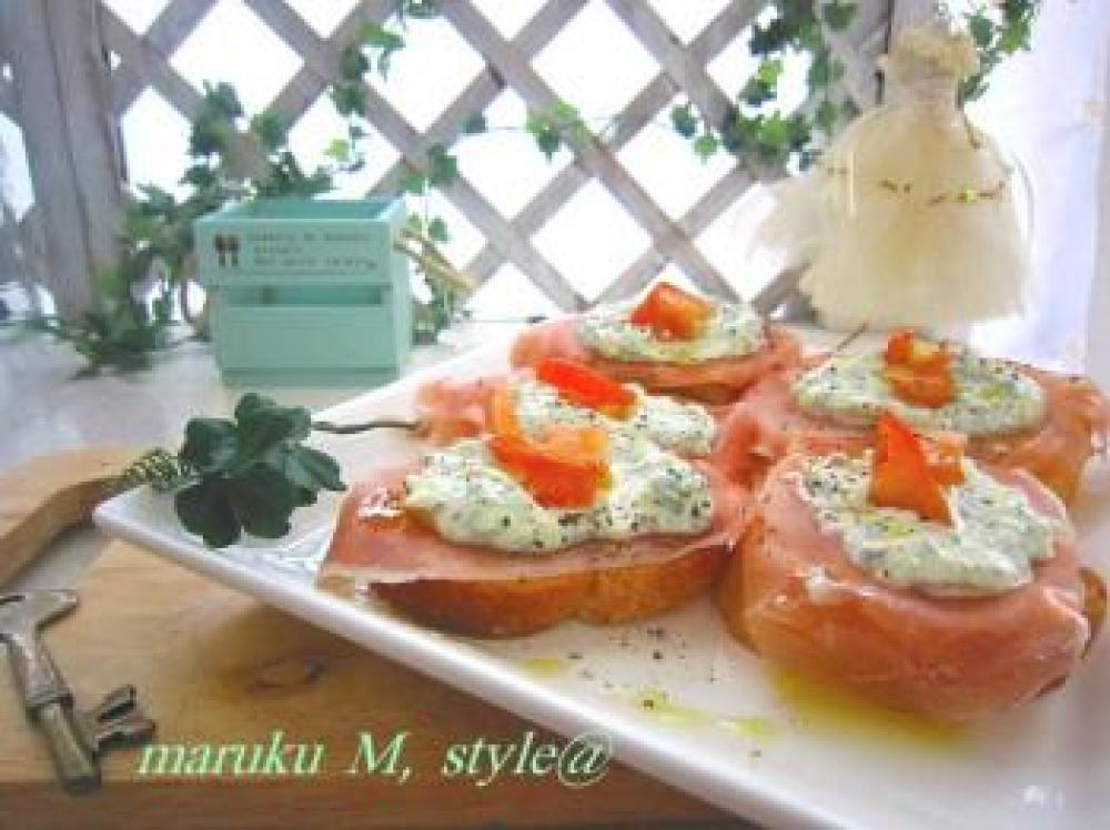 ![]() フランスパンの上に生ハムをのせます!そこへ、⑤のディップをのせます。