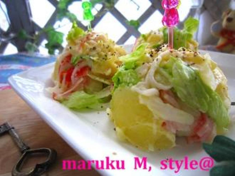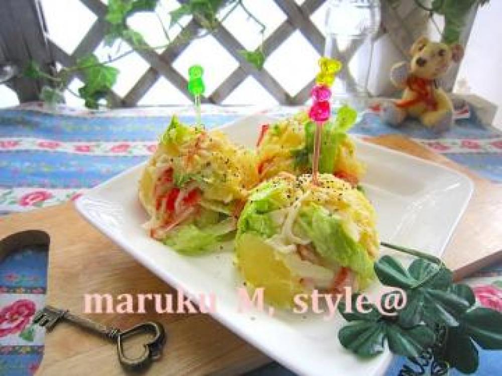 ジャガイモを熱いうちあらくつぶしておきます。レタスは細かく契り洗って水をよく切ります。