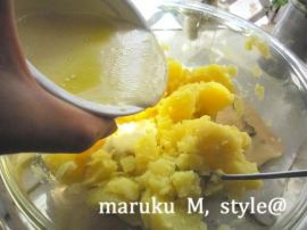 ![]() ジャガイモは人肌程度に冷めれば、★の材料を入れて味をなじませます。