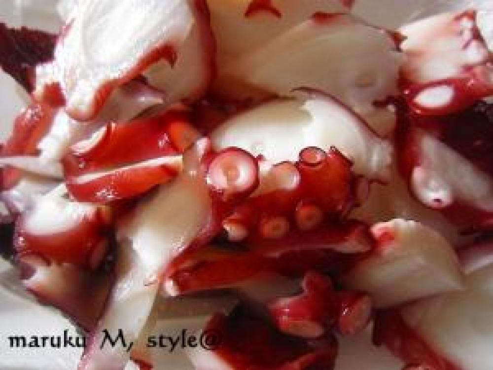![]() タコは薄切りに切ります。(のどにつまらないように!)さっと30秒ほど、湯通しします。