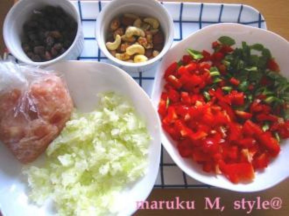 ![]() 野菜は細かく切ります。玉ねぎはみじん切りにしてレンジで2分チン!して水分をよく絞ります。