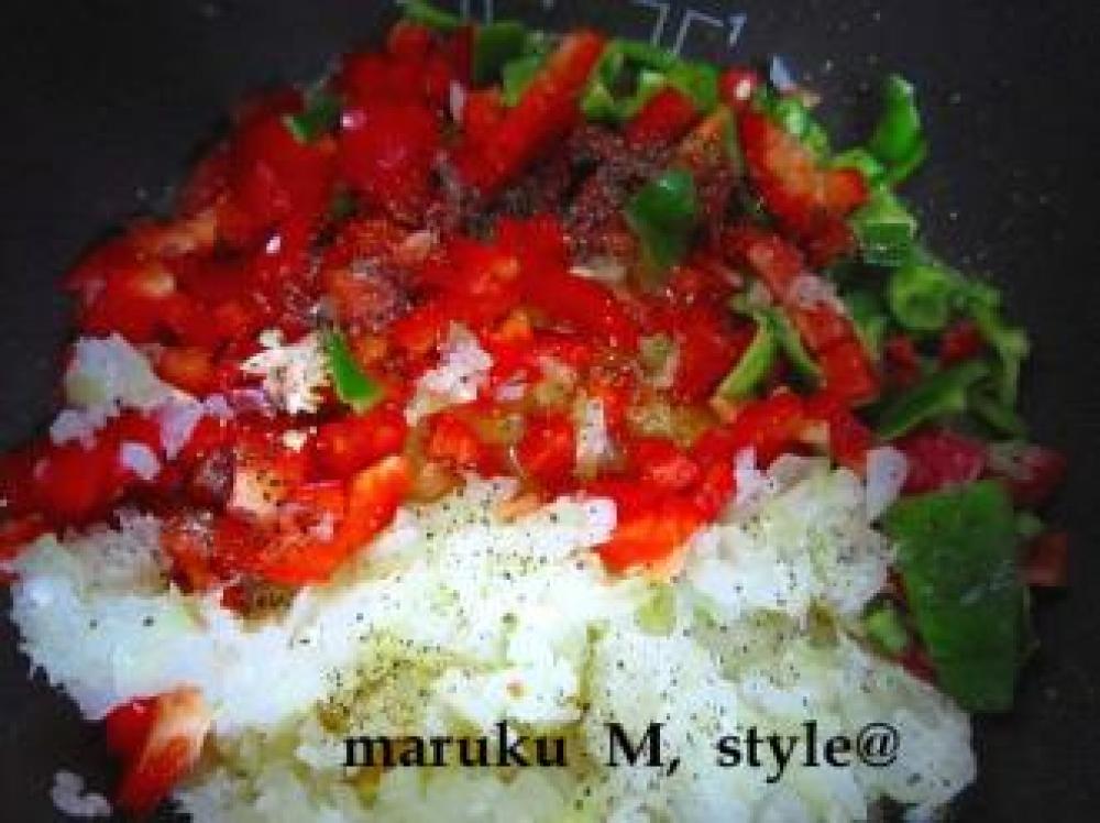 ![]() 野菜の水気を十分に取り(べちゃつくので)入れます。タップリの野菜です! 上から、粗挽きこしょうタップリ!