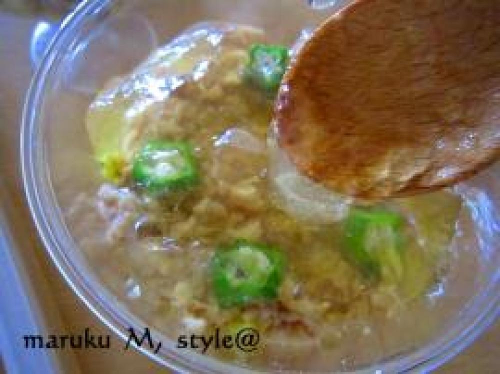 ![]() その上に⑤のオクラの薄切りをのせて、上から、コンソメジュレをかけます。仕上げに麺つゆを少しかけると味がしまります!