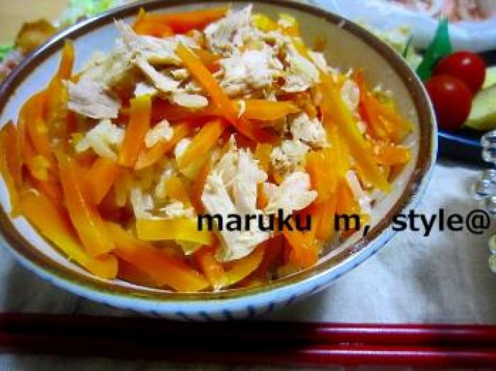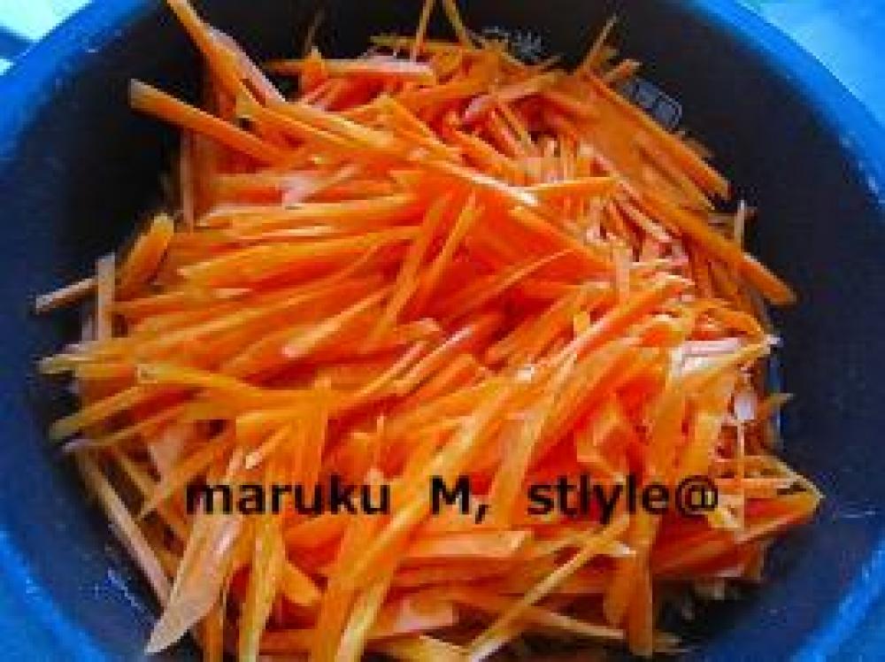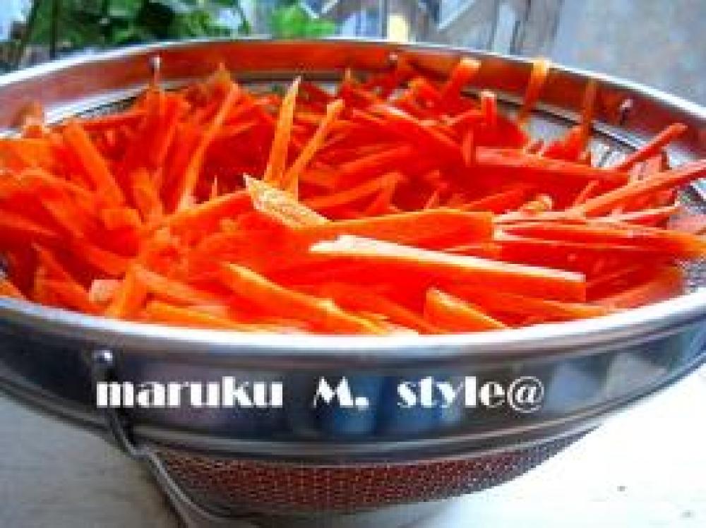 ![]() 人参は細長く切ります。(スライサーでもOK!です。)よく洗いざるで水を切ります。